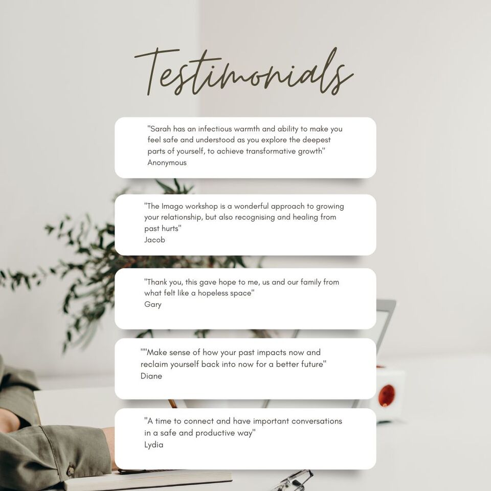 Exciting Imago Therapy workshops are coming in 2026, offering couples and individuals a chance to deepen connection, improve communication, and transform their relationships. More information will be announced soon. If you’re interested in attending one of these upcoming workshops, please contact Sarah at sarah@counsellingprovider.co.nz, call 021 252 7620 or select the BOOK NOW option
